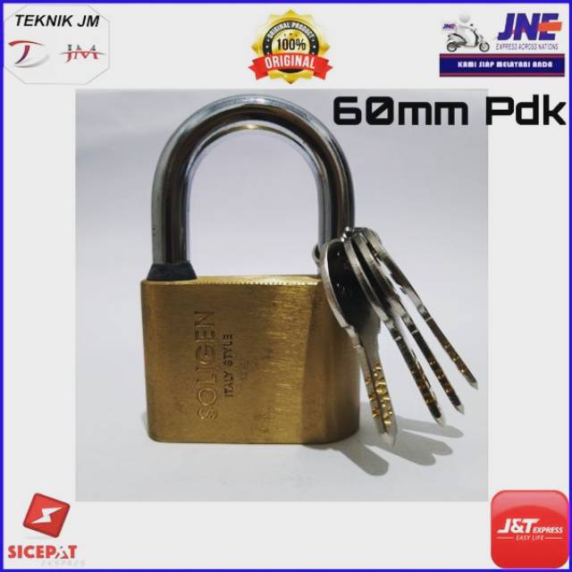 Gembok- Merk : Soligen- Ukuran : 60 mm- Leher (shackle) : Pendek- Material : Kuningan (Brass)- Sistem Per, anak kunci bisa dicabut dalam posisi terkunci maupun tidak terkunci.- Design Body Gembok Elegan dan Menarik.- Computer Key dengan 4 pcs Anak K