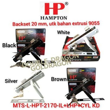 Kunci Set - Khusus Pintu Frame Aluminium- Dipakai di bahan pintu extrusi 9055- Merk : HAMPTON- Type : MTS-L-HPT-2170-IL+LHP+CYL KD- Sistem baut tembus utk handle.Handle Plat dengan 4 pilihan warna :- White- Black- Silver- BrownDimensi plat handle- Lebar : 26 mm (= 2,6 cm)- Panjang : 200 mm (= 20 cm)- Tebal plat : 2 mmDimensi Mortise Lock/Lockcase/Body- Backset : 20 mm (= 2 cm)- Lebar x Panjang : 36 mm x 157 mm- Tebal lockcase : 15 mmCylinder :- Panjang : 63 mm- 3 pcs anak kunci standar/biasa.Bila ada plat di tengah lubang cylinder, mohon digeser ke samping agar cylinder bisa masuk dengan sempurna.HARGA PE