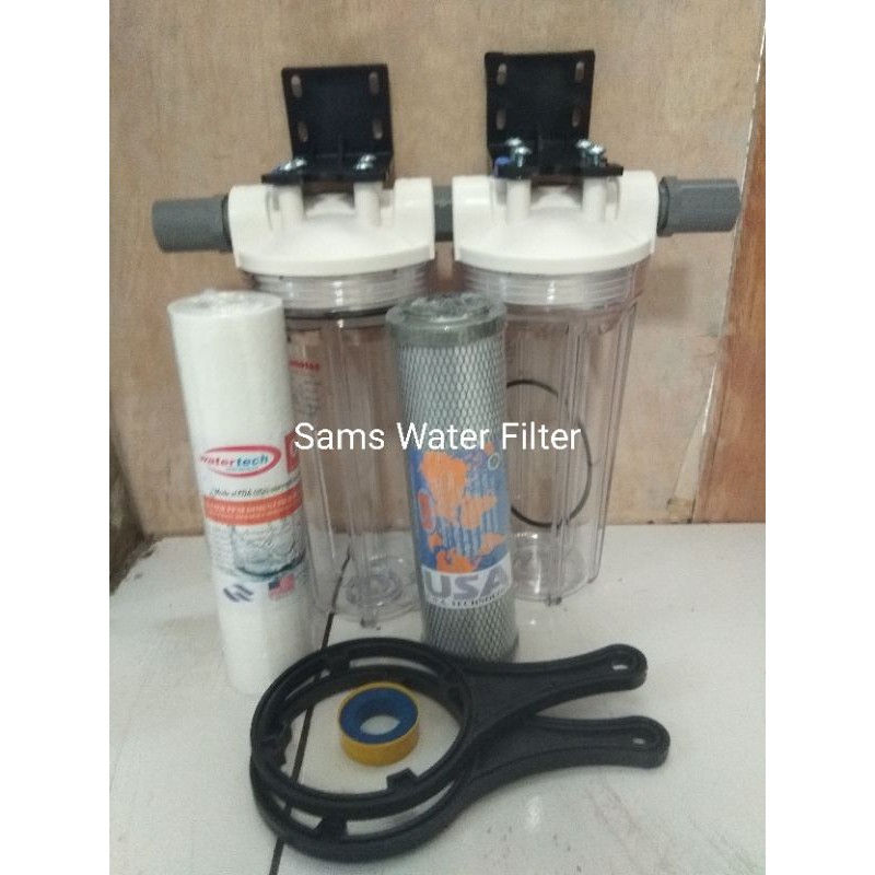 Paket ini terdiri dari 2 jenis filter / saringan air, yaitu :1. Filter Tahap I ( Sedimen Filter ) berfungsi utk menyaring partikel yang besar seperti : kotoran, lumpur, pasir dan debu.2. Filter Tahap II ( CTO / Filter Pasir Aktif) berfungsi utk menurunkan kadar besi dalam air, bau, warna, rasa tidak sedap.Paket ada 2 pilihan ukuran drat in out 1/2" atau 3/4" yg dpt disesuaikan dg keperluan anda.Kami kirim berdasarkan pilihan anda.Pilihan ukuran : - Clear S = drat in out 1/2". - Clear L = drat in out 3/4".Bila tidak memilih ukuran atau memberikan note ke kami, barang kami kirim radoom berdasarkan stock yg ada.Isi paket :1. Housing filter 10" merk Nanotex bening = 2 pcs2. Cartridge Sedimen Filter 3 atau 5 micron = 1pcs.3. Cartridge CTO = 1 pcs.4. Bracket Housing = 2 pcs.5. Skup bracket = 8 pcs.6. Wrench / Kunci Housing = 2 pcs 7. Double nepple = 1 pcs8. Sok Drat luar = 2 pcs9. Sealtape = 1 pcs.note : - kami tdk menanggung kerusakan / kehilangan akibat pengiriman krn semua barang yg kami kirim kami cek terlebih dahulu hrs dlm kondisi baik.- Agar lebih aman sebaiknya barang yg akan dikirim dengan packing kayu dengan link pembeliannya sbb :https://shopee.co.id/product/293046156/3754179937Paket ini disarankan utk kandungan airnya keruh, bau dan warna ( tdk efektif utk air yg kadar kandungan besi / mangan nya tinggi ).Hanya tinggal pasang dan cara pemasangannya sangat mudah, kami siap bantu.Terima kasih dan selamat berbel