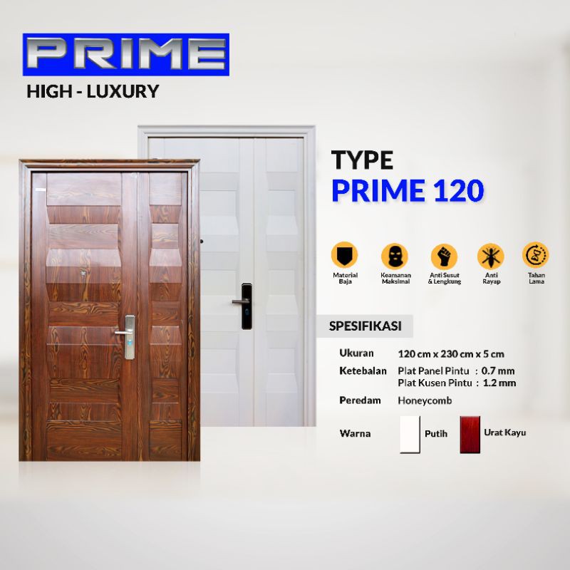 BARANG READYPengiriman 2-5 hari Kerja. Berdasarkan Pengiriman dari EKSPEDISI / PABRIK. Karna ada antrian PengirimanSabtu Minggu tidak terhitungSpeksifikasi :- Lebar : 120cm- Tinggi : 230cm- Ketebalan PLAT pintu : 0.7mm- Ketebalan PLAT Kusen : 1.2mm - Pengiriman di luar jabodetabek menggunakan jasa Ekspedisi ( Cost berdasarkan alamat pengiriman )Sebelum Pesan Harap Chat Terlebih Dahulu Untuk Ketersediaan Stock dan Pemilihan Arah Bukaan!Sebuah Terobosan terbaru produk bahan bangunanAlternatif Terbaik pengganti Pintu Kayu KonvensionalKEUNGGULAN PINTU RUMAH FORTRESS:EKONOMIS - Rendah Biaya PerawatanAMAN - INDAH - KUAT - KOKOH - TAHAN LAMATAHAN TERHADAP SEGALA PERUBAHAN CUACAANTI - RAYAP - LAPUK - SUSUT – LENGKUNG1 unit Pintu FORTRESS sudah termasuk:* Panel Pintu baja* Finishing Urat Kayu Alami / putih* Kusen Baja ber-architrave* 4 Set Engsel Tersembunyi* Kunci dgn 5 titik penguncian* 7 Pcs anak kunci komputer A-B Lock system* Handle* Kaca Pengintip* Karet Peredam* 6 set Baut Instalasi dynabolt* 6 Pcs cover lubang instalasiGaransi barang Original 100%Garansi Handle & Cat 2 Tahun ( Dengan syarat dikirim dari pabrik langs
