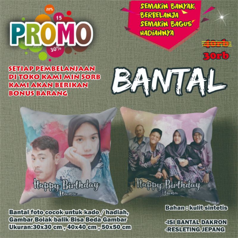 Open Reseller & DropshipKITA PRODUKSI LANGSUNG barang" CUSTOM Digital PrintingBantal foto cocok untuk kado / hadiah , Gambar Bolak balik Depan BelakangTersedia ukuran30x30 cm40x40 cm 50x50 cm Bahan : kulit sintetis -ISI BANTAL DAKRON - RESLETING JEPANGCara pesen: Gambar/foto+nama di Bantal+ukuran Bantal, Bila tidak paham chat adminProses Produksi 3-5 Hari Paling Lambat 1Minggu Kita juga Produksi Barang Lain Cek Katalog di Toko Kita :)Komplain/kritik/saran langsung via chat ya, Mohon Maaf Bintang 1.2.3 Tanpa Alasan Jelas. Auto BL