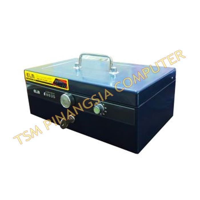 Elm-8835 Cash Box - Brankas - Safe boxELM Cash Box 8835memiliki kapasitas dan ruang yang cukup besarserta aman sebagai tempat untuk menyimpan uangatau barang berharga lainnya.Dengan fasilitas coin slot dan coin tray.Cash box ini juga sudah dilengkapi dengan kunci pengaman dan tombol untuk kode pengaman.Ukuran:279 x 179 x 11